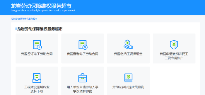网厅企业端依托“龙岩市人社和医疗保障公共服务网”构建,集签订查看电子劳动合同、企业缴纳工资保证金、申请撤销农民工工资专用账户、工程建设领域内业资料下载、用人单位申请劳动人事争议仲裁、劳动法律法规政策查询下载等功能为一体,在线为企业提供方便快捷的劳动保障类服务,维护企业合法权益,着力优化营商环境。