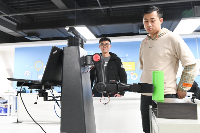 2019年12月26日,在合肥工业大学机器人与智能技术实验室,大学生在调试服务机器人。新华社记者 张端 摄