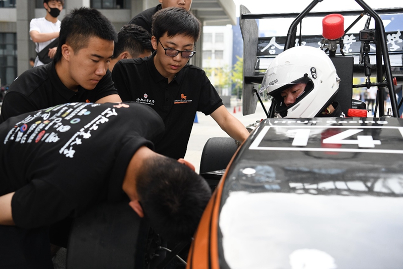 2021年9月25日,合肥工业大学学生在调试第12代“越影”燃油赛车。新华社记者张端 摄