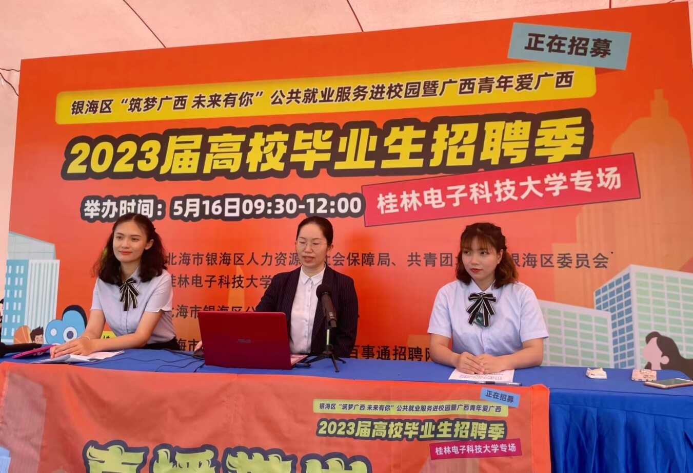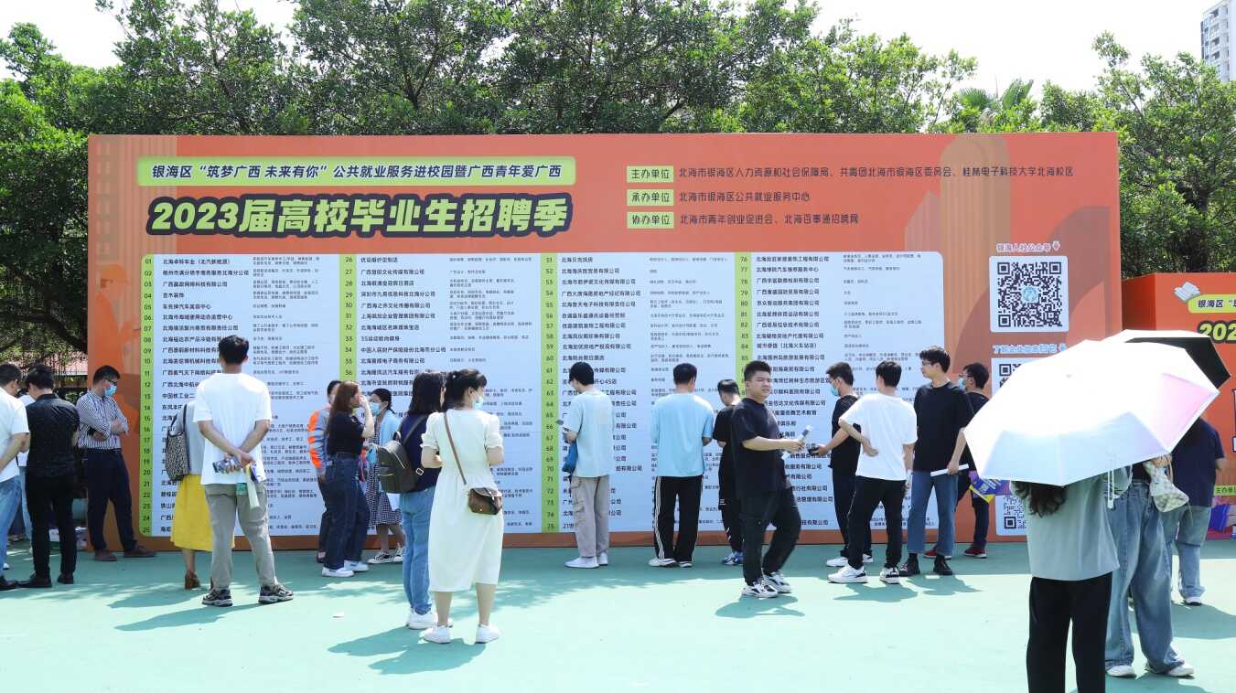 近日,银海区“筑梦广西 未来有你”公共就业服务进校园暨广西青年爱广西2023届高校毕业生招聘季活动在桂林电子科技大学(北海校区)西校区火热举办。此次活动由北海市银海区人力资源和社会保障局、共青团北海市银海区委员会、桂林电子科技大学北海校区联合主办、银海区公共就业服务中心承办、北海市青年创业促进会协办。