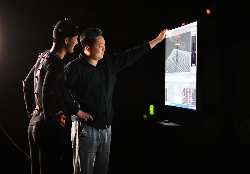 2024年4月23日,数字孪生应用技术员崔盛辑(右)和同事在查看电脑生成的虚拟角色动作。新华社记者 赵子硕 摄