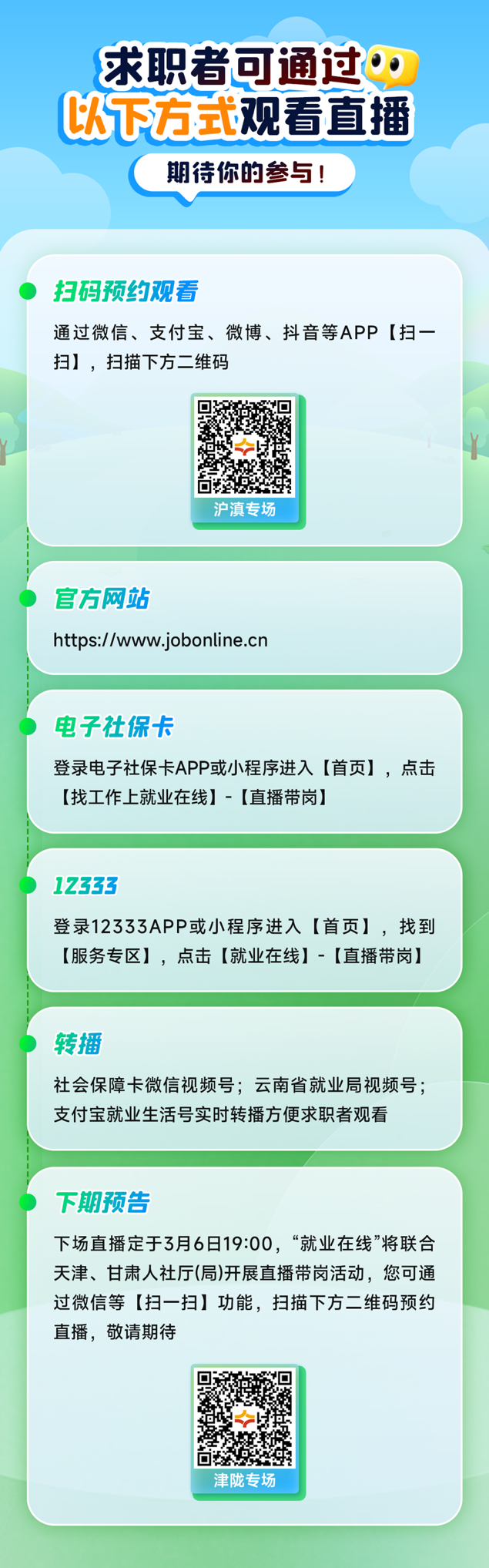 “春风送岗促就业 精准服务暖民心”,2025年春风行动火热进行中,“就业在线”平台将开展系列直播带岗活动。2月27日19:00,“就业在线”平台携手上海人力资源社会保障局、云南人力资源社会保障厅开展春风行动跨省劳务对接沪滇专场直播,为您带来权威政策解读,优质岗位推介,专业求职指导,助力广大求职者就业。