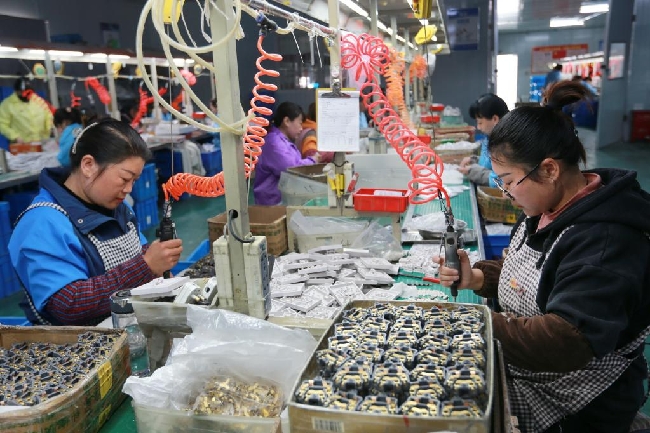 3月28日,在淮北市杜集区石台镇农民工创业园,一家开关生产企业的工人在车间内忙碌。新华社发(万善朝 摄)