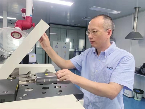 苏州金宏气体股份有限公司研发中心副主任孙猛博士在实验室从事电子特气研究。苏州市人社局供图