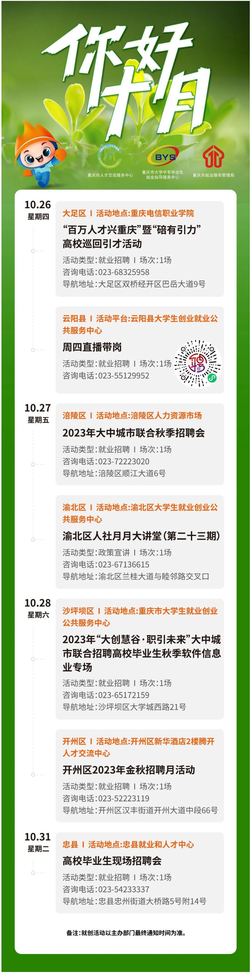 近期,全市共7场大学生就业创业活动。其中,包括2023年“大创慧谷·职引未来”大中城市联合招聘高校毕业生秋季软件信息业专场、高校毕业生现场招聘会、周四直播带岗等活动,期待你的参与!