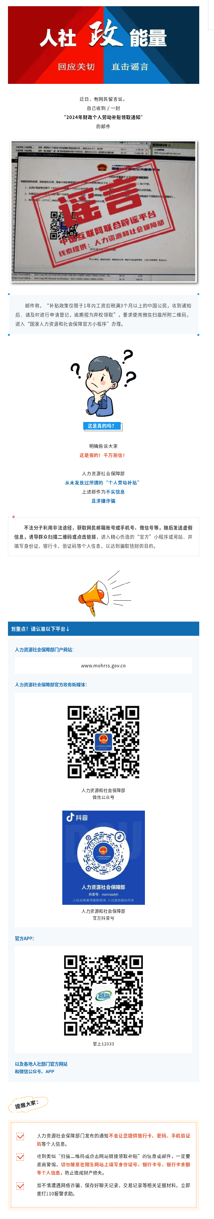 扫码可领“2024年个人劳动补贴”?小心是诈骗!