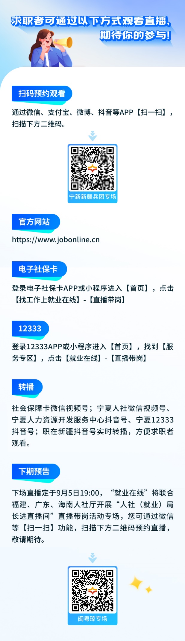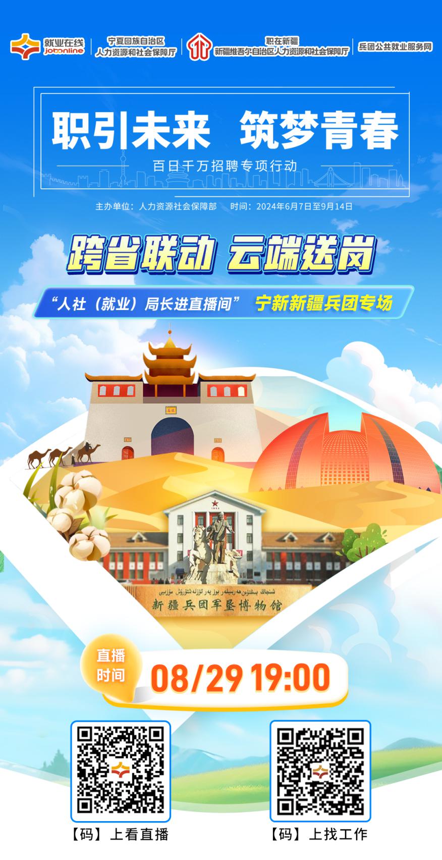 “职引未来 筑梦青春”,2024年百日千万招聘专项行动火热进行中,“就业在线”平台将开展“人社(就业)局长进直播间”跨省联动直播带岗系列活动。8月29日19:00,“就业在线”平台携手宁夏、新疆、新疆生产建设兵团人社厅(局)开展宁新新疆兵团联动直播带岗,人社(就业)局长做客直播间,为您带来权威政策解读、优质岗位推介、专业求职指导,助力宁夏、新疆、新疆兵团广大求职者就业。