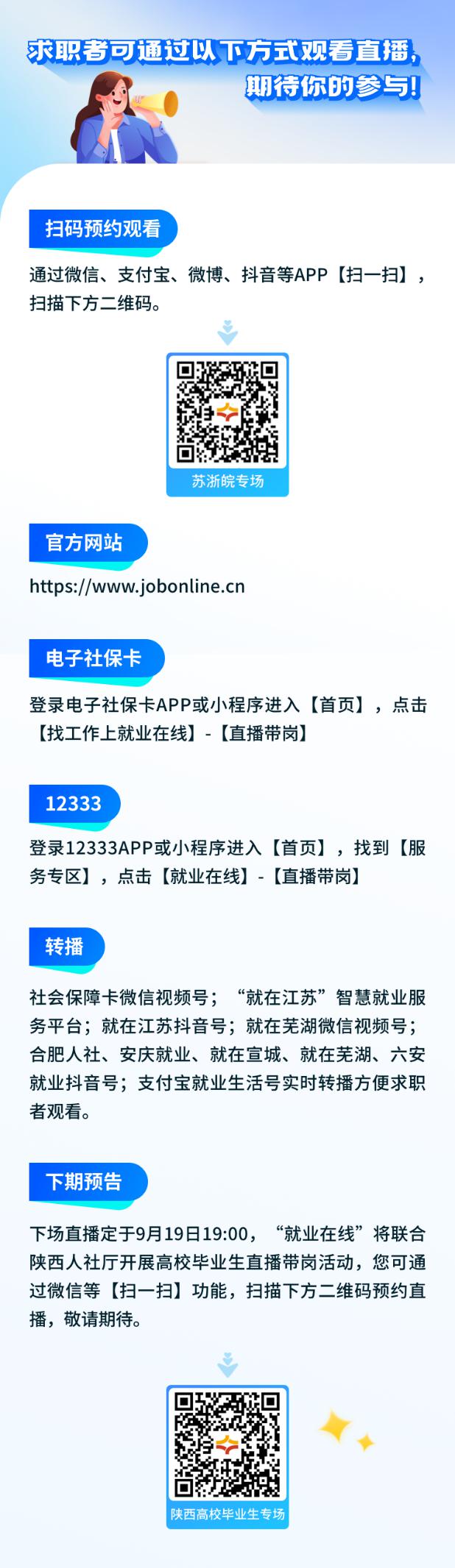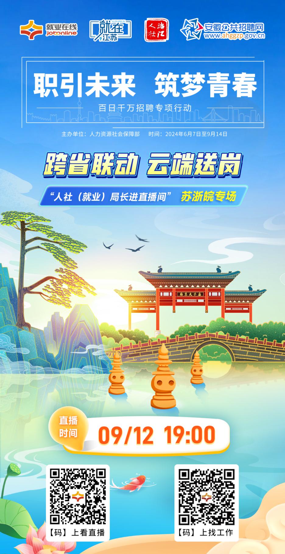 “职引未来 筑梦青春”,2024年百日千万招聘专项行动火热进行中,“就业在线”平台将开展“人社(就业)局长进直播间”跨省联动直播带岗系列活动。9月12日19:00,“就业在线”平台携手江苏、浙江、安徽人社厅开展苏浙皖联动直播带岗,人社(就业)局长做客直播间,为您带来权威政策解读、优质岗位推介、专业求职指导,助力江苏、浙江、安徽广大求职者就业。