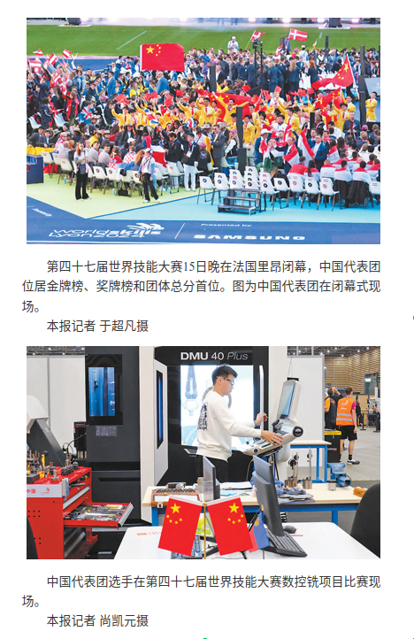第四十七届世界技能大赛9月10日至15日在法国里昂举行,来自近70个国家和地区的约1400名选手参加。中国代表团在本次大赛中表现出色,以36枚金牌、9枚银牌、4枚铜牌和8个优胜奖位居金牌榜、奖牌榜和团体总分首位。中国参赛选手以精湛技艺和专业精神,展现了中国青年技能人才的卓越风采,以及中国在职业技能人才培养上的成果。闭幕式上,上海作为第四十八届世界技能大赛举办地,与里昂进行了世界技能大赛会旗交接。