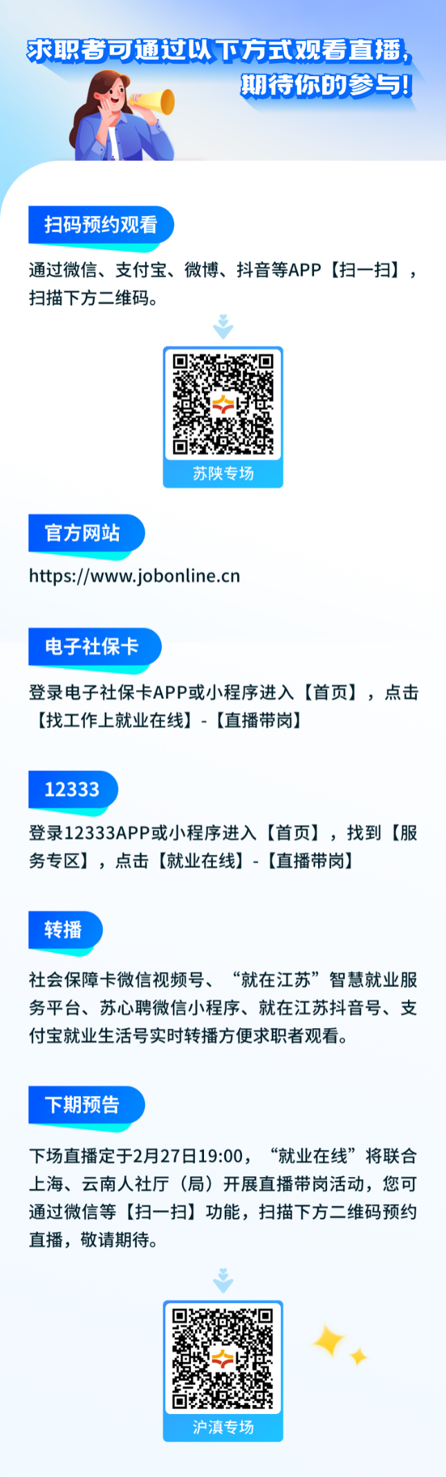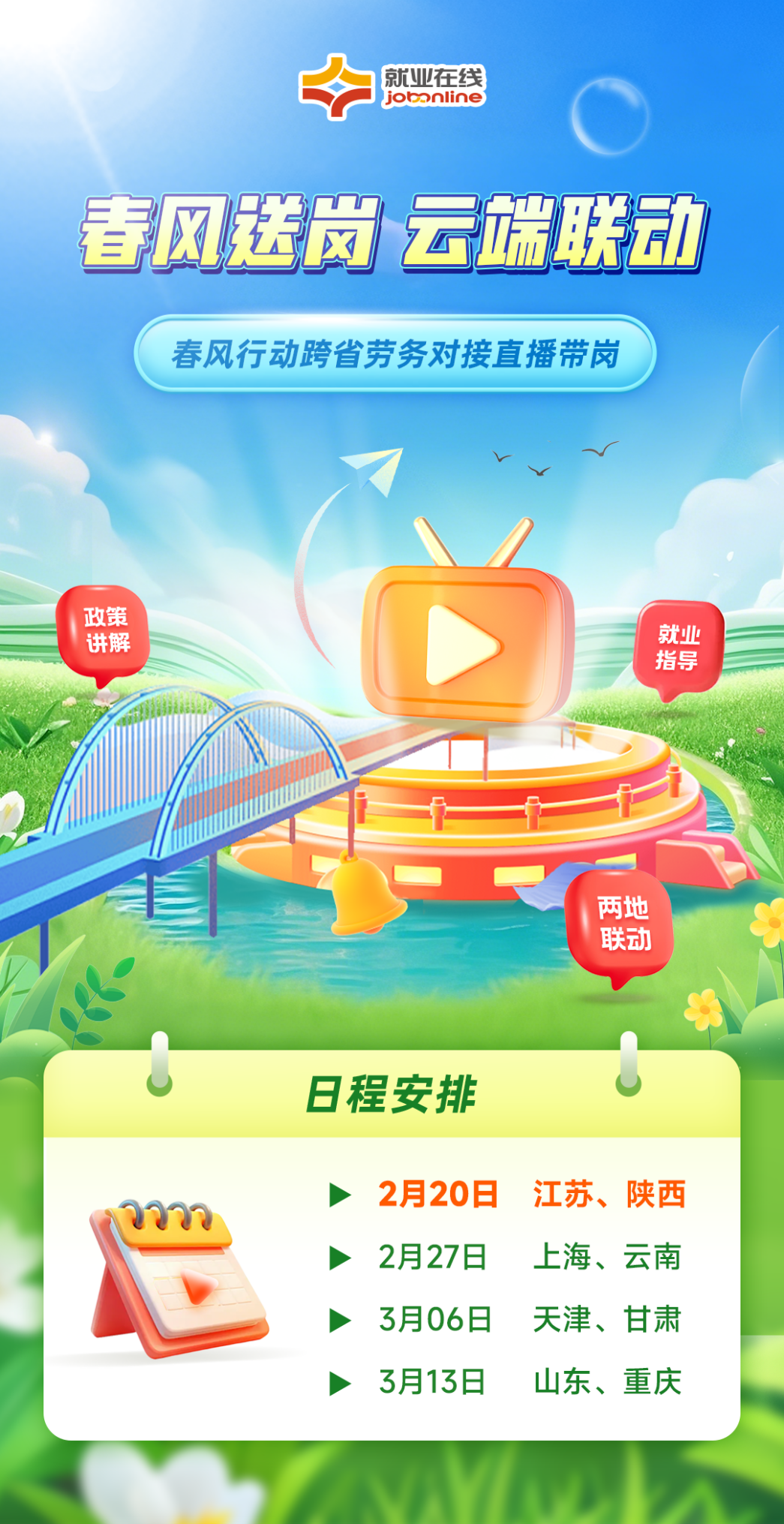 2月20日19:00,“就业在线”平台携手江苏、陕西人力资源和社会保障厅开展春风行动跨省劳务对接苏陕专场直播,为您带来权威政策解读,优质岗位推介,专业求职指导,助力广大求职者就业。