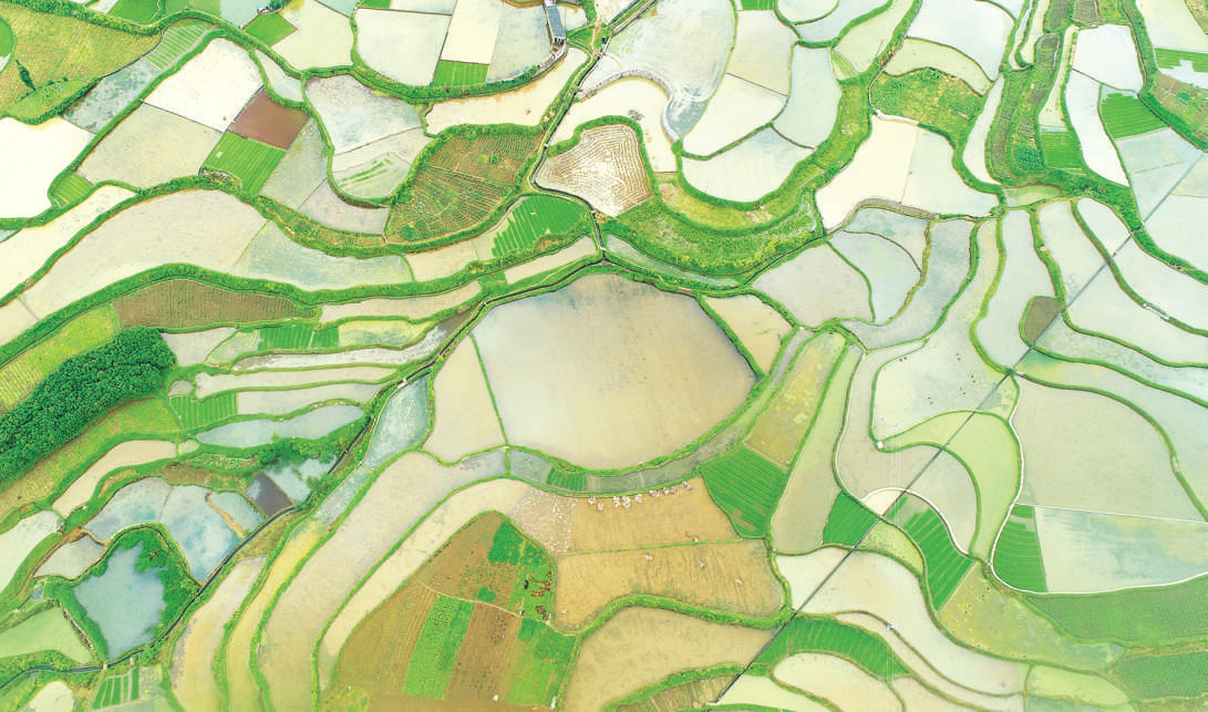 图为小满时节,位于该县扬武镇的“硒锌米”种植田园,秧苗青青,田水丰盈。